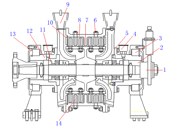 7.轉(zhuǎn)子 8.定子 9.水斗 10.側(cè)殼 11.主軸承 12.擺動(dòng)軸承 13.軸承蓋 14.定子螺栓 |