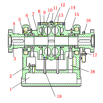 | 1.底座 2.左右軸承座 3.主軸部件 4.聯軸節(jié) 5.軸承壓板 6.骨架油封 7.軸套 8、9.雙金屬軸套